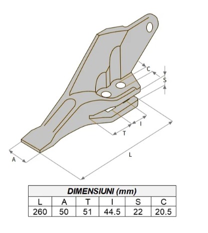 Dinte lateral dreapta pentru cupa buldoexcavator, utilizat pentru protectia laterala a cupei si cresterea eficientei in lucrarile de excavare.