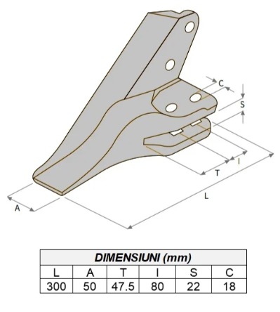 Fabricat din materiale rezistente la uzura si socuri, acest dinte ofera o durata de viata extinsa si performanta constanta in conditii dificile de lucru.